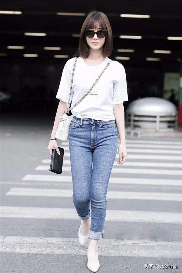 T恤和牛仔裤的搭配可以说是最为常见的日常穿搭,而九分长度的牛仔裤也是很多女生首选的单品。九分长度的裤子长一点,太长了,短一点,又显得身材比例不好。